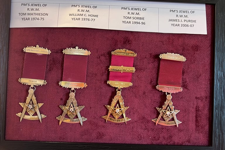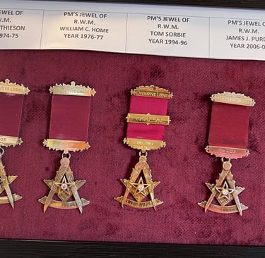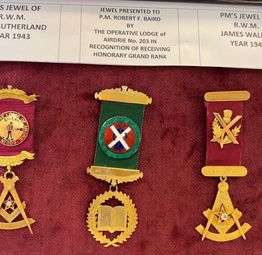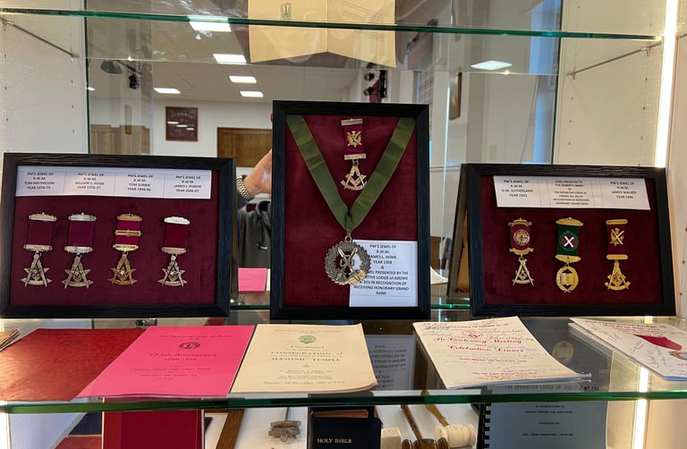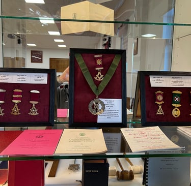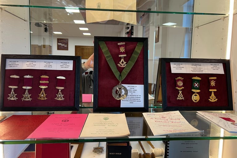 Lodge display cabinets have had the glass doors and shelves fitted and we have put some of the lodge artifacts on display, temple is looking better and better all the time, below are photos of PM jewels which have been handed in by the families