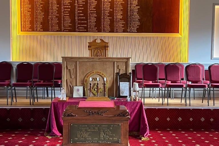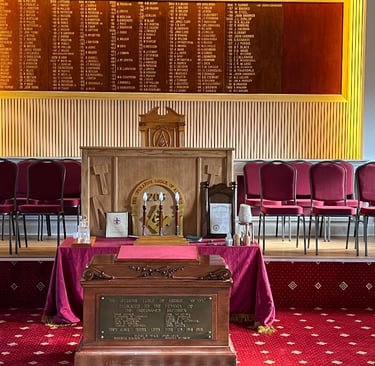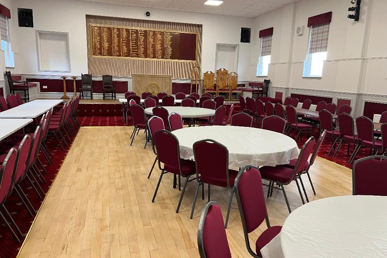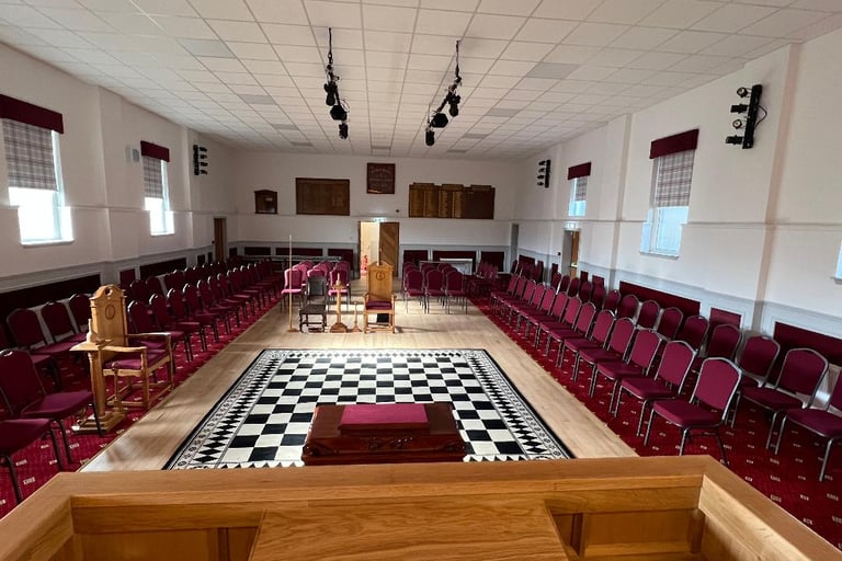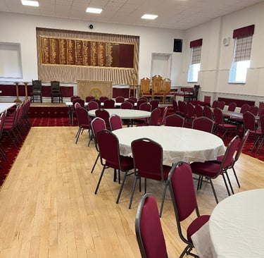 Brethren, now that work is progressing well with the roof and hall we need to consider how the hall should look, obviously it is a masonic hall and that has to be our main priority, but our hall is also well used for private functions which generates a good income for the lodge so we need a balance, All the past masters boards etc. will be put back up as will the plaques with the working tools, banner and other paraphernalia.